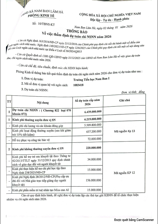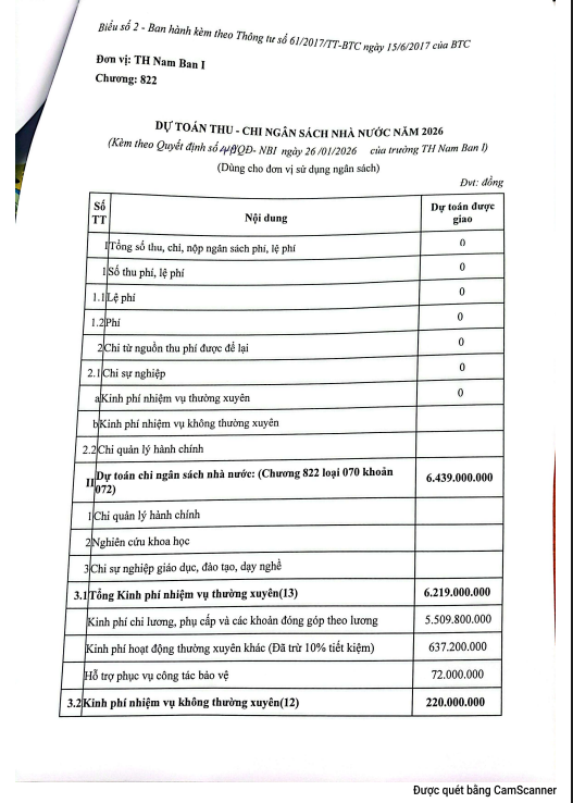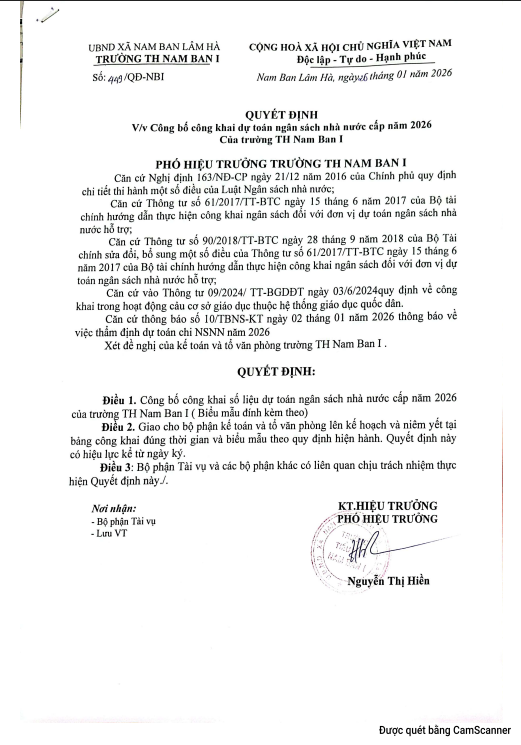 QUYẾT ĐỊNH V/v Công bố công khai dự toán ngân sách nhà nước cấp năm 2026 Của trường TH Nam Ban I